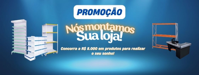 Participe da nossa campanha de aniversário e concorra a R$ 8000,00 em produtos para montar a sua loja em qualquer segmento! Seu sonho é abrir um pet shop? Uma farmácia? Um mercado? Não importa qual segmento, nós vamos presentear um ganhador com produtos a sua escolha, entre eles gôndolas de todos os modelos, porta pallet e mini porta pallet.